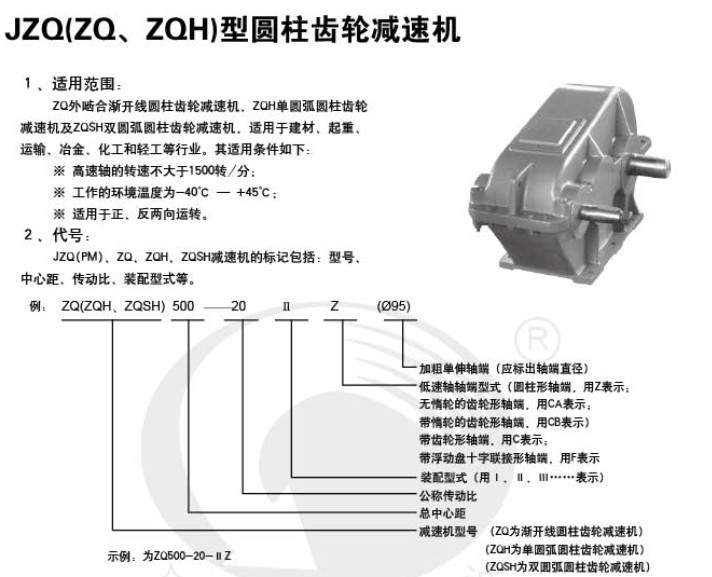 JZQ(ZQ.ZQH)型圓柱齒輪減速機,廣泛應用于各種起重、運輸、礦山機械及其他各種機械中作減速之用。